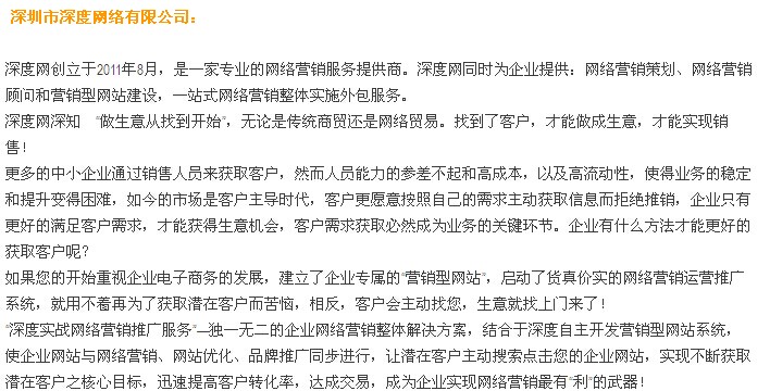 深度網(wǎng)專業(yè)營(yíng)銷型網(wǎng)站建設(shè)服務(wù)商,深度深知,我們不是為了做網(wǎng)站而做網(wǎng)站,不是為了推廣而推廣,而是為了營(yíng)銷而做網(wǎng)站,為了效果而做推廣,攜手深度,突破網(wǎng)絡(luò)營(yíng)銷瓶頸,開啟全網(wǎng)營(yíng)銷新格局!